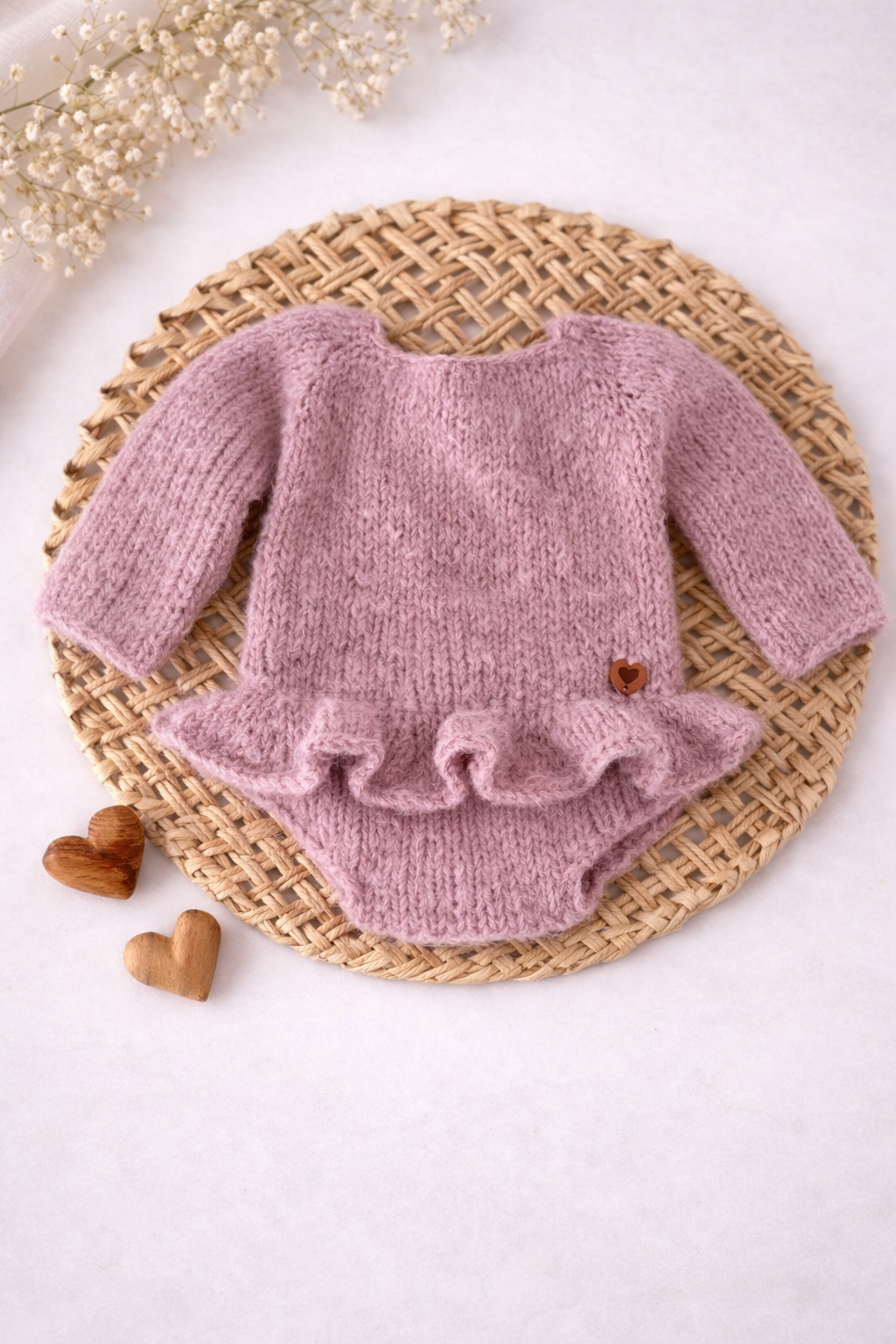 Confeccionado em tricô manual, com fio macio e toque aconchegante, ele envolve o bebê com conforto, garantindo beleza e segurança durante o ensaio.