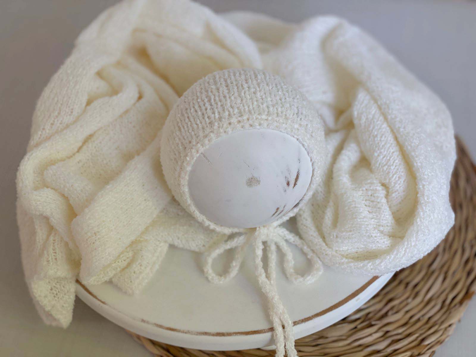 O wrap possui um toque leve e agradável, enquanto a touca simples complementa a composição de forma clássica e harmoniosa, valorizando o ensaio sem tirar o protagonismo do bebê.