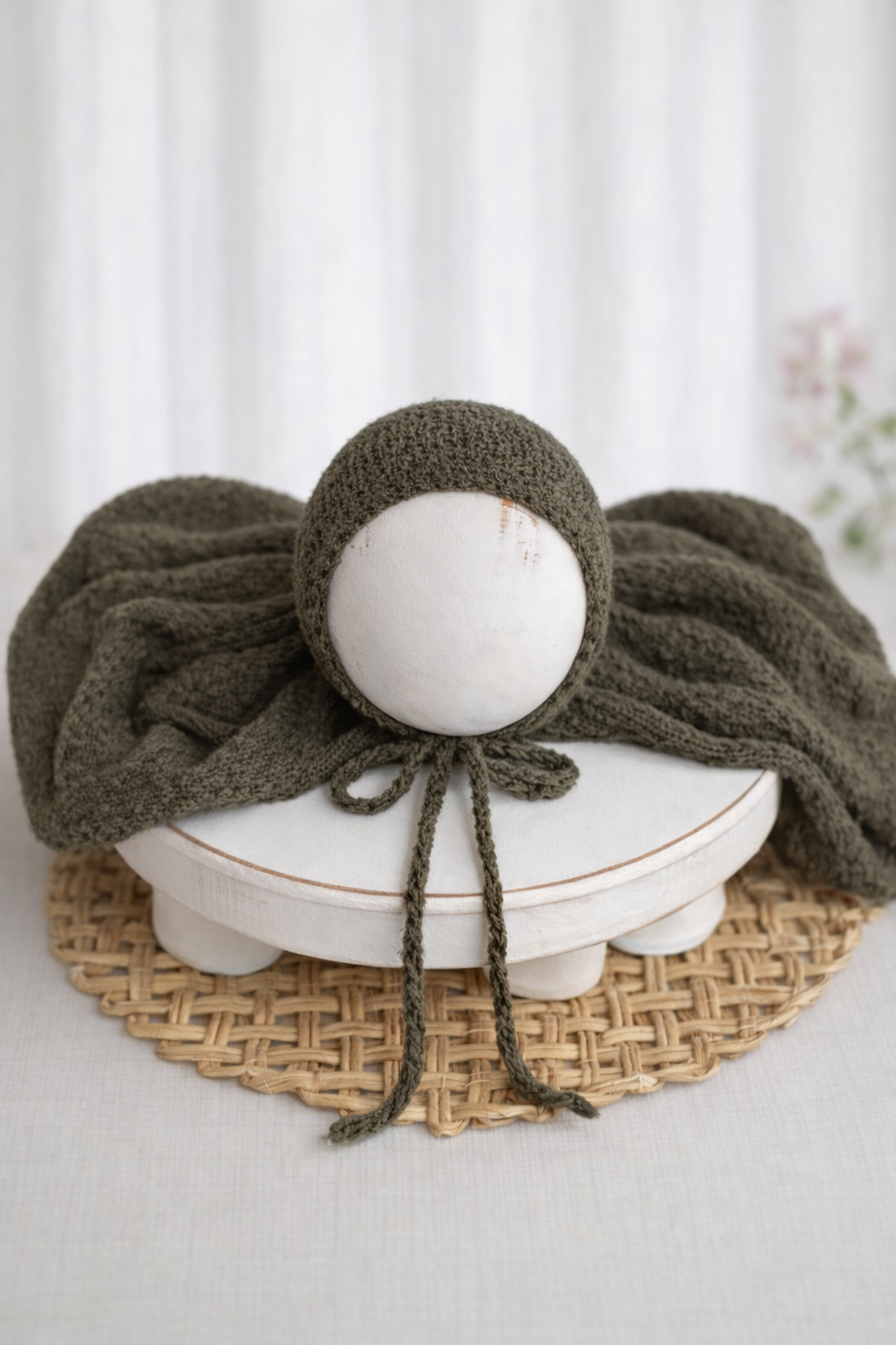 O wrap possui um toque leve e agradável, enquanto a touca simples complementa a composição de forma clássica e harmoniosa, valorizando o ensaio sem tirar o protagonismo do bebê.