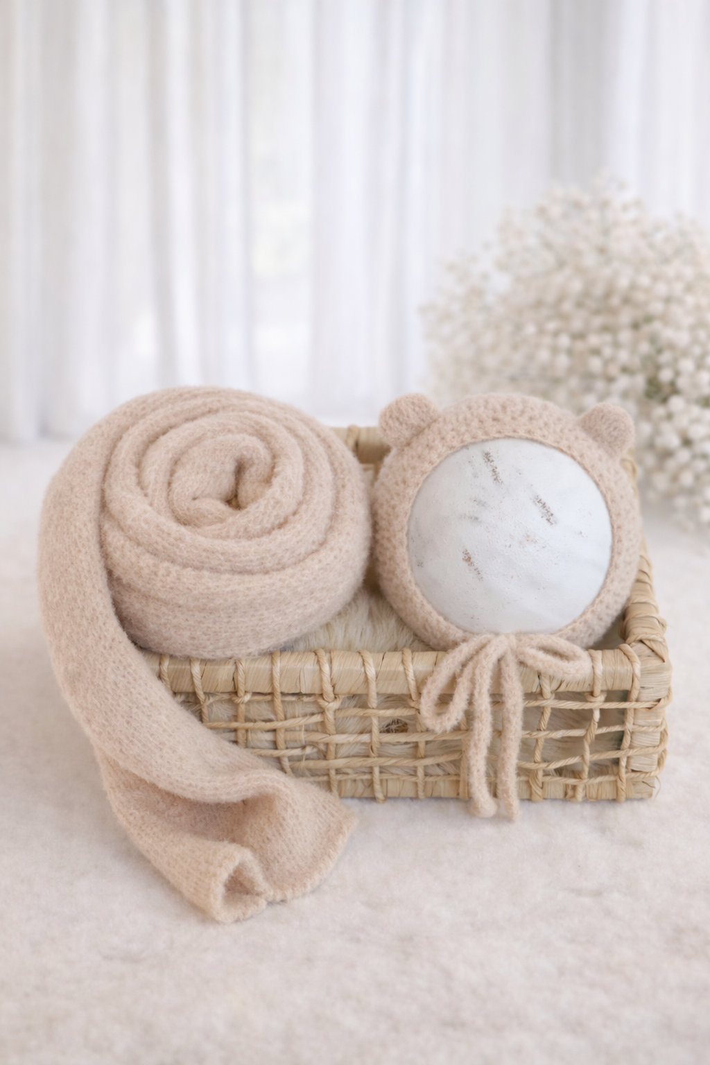 O Conjunto Wrap e Touca Ursinho Comfy foi desenvolvido especialmente para ensaios fotográficos Newborn, unindo conforto, delicadeza e um visual atemporal.