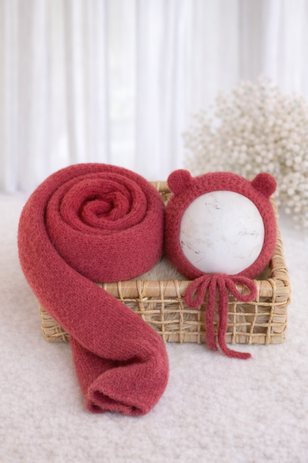 A touca com orelhinhas de ursinho traz um toque lúdico e irresistível, enquanto o wrap possui excelente elasticidade, facilitando o posicionamento do bebê durante o ensaio.