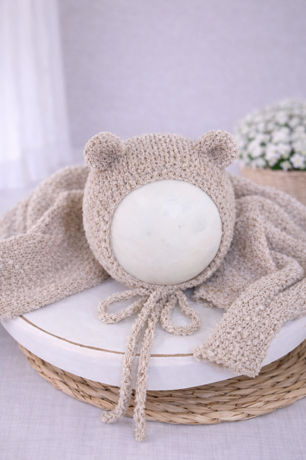O wrap possui um toque leve e agradável, enquanto a touca de ursinho adiciona um detalhe lúdico e irresistível, perfeito para composições clássicas e afetivas.