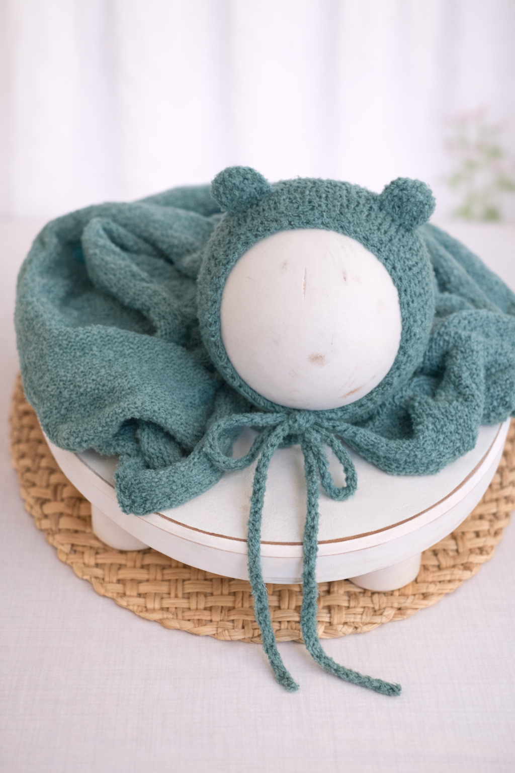 O wrap possui um toque leve e agradável, enquanto a touca de ursinho adiciona um detalhe lúdico e irresistível, perfeito para composições clássicas e afetivas.