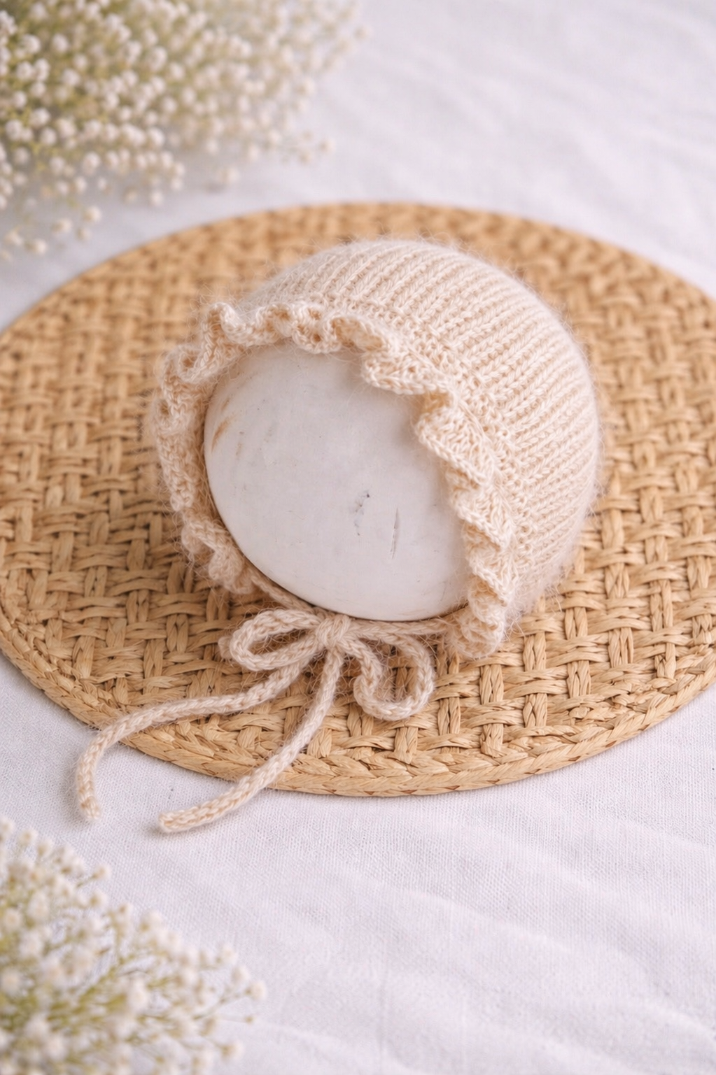 A Touca Babadinho Eloá é confeccionada em tricô manual com fio tipo angorá, extremamente macio e com leve efeito felpudo que traz suavidade e um acabamento encantador.