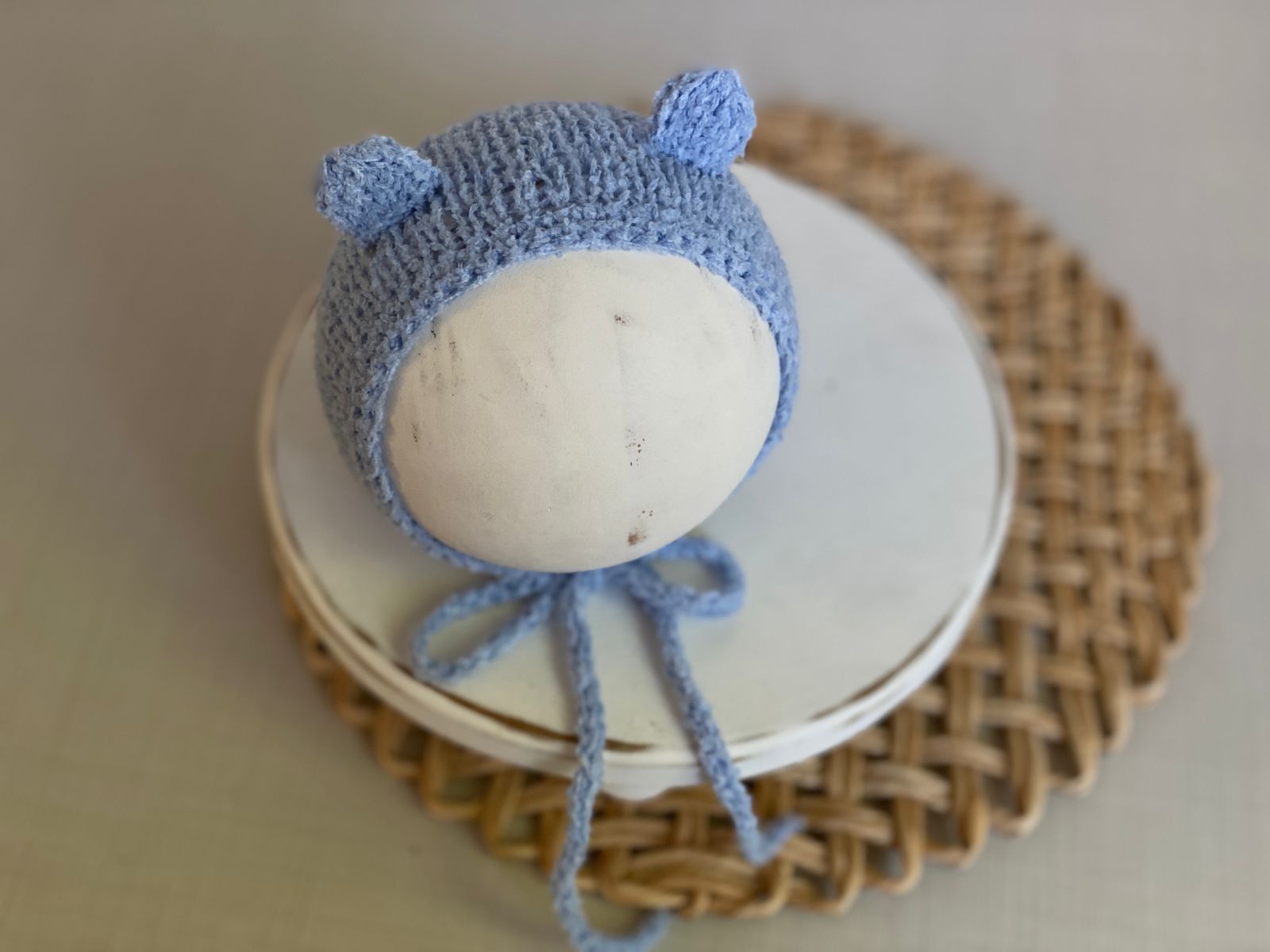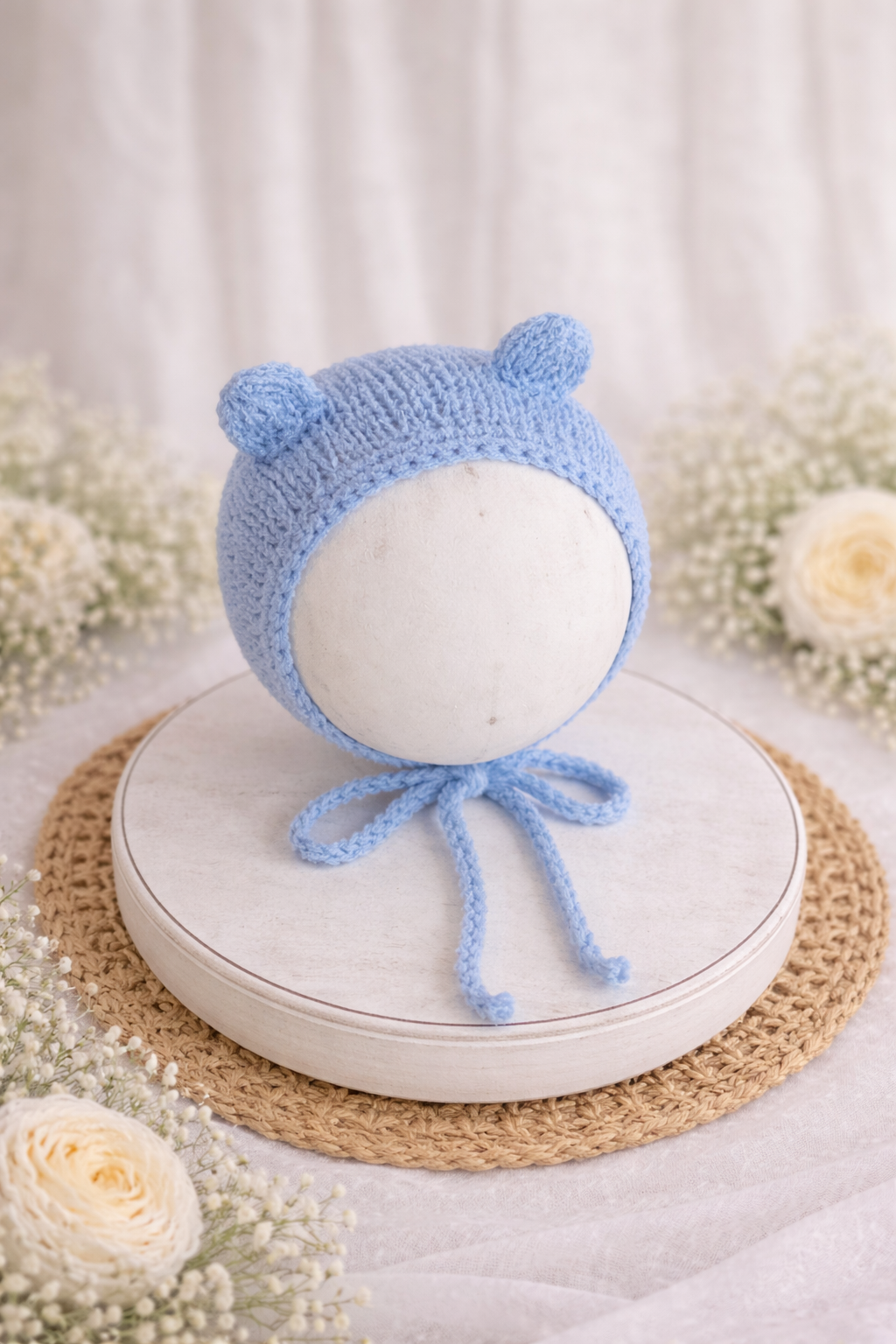 Seu design com delicadas orelhinhas de ursinho adiciona um toque especial e encantador ao ensaio, sem perder a elegância e mantendo o protagonismo do bebê em cada clique.