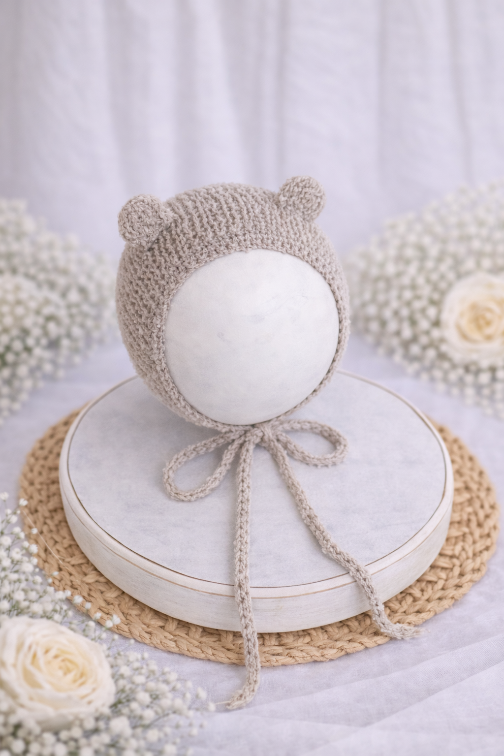 Seu design com delicadas orelhinhas de ursinho adiciona um toque especial e encantador ao ensaio, sem perder a elegância e mantendo o protagonismo do bebê em cada clique.