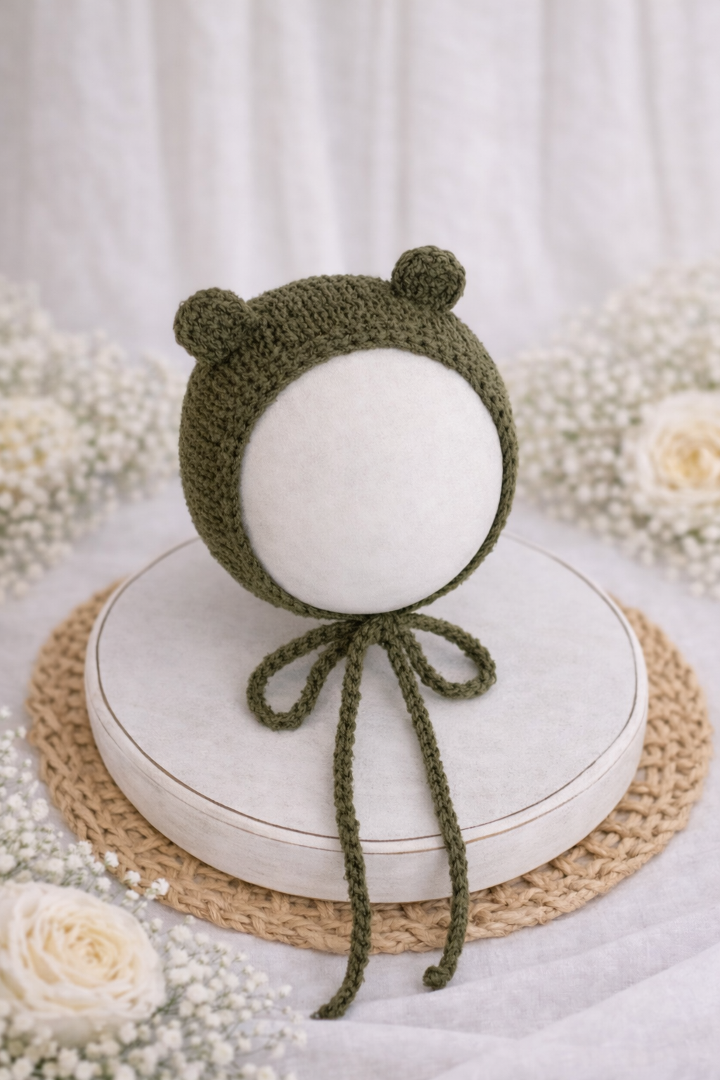 Seu design com delicadas orelhinhas de ursinho adiciona um toque especial e encantador ao ensaio, sem perder a elegância e mantendo o protagonismo do bebê em cada clique.