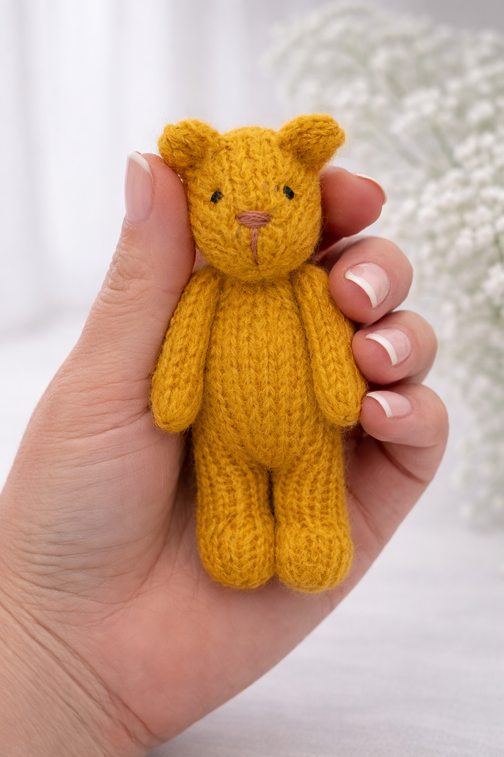 Nosso ursinho de tricô é feito à mão com fio mohair, um material leve, macio e extremamente delicado ao toque – ideal para composições encantadoras em ensaios newborn. Com aproximadamente 14 cm, ele é o tamanho perfeito para as mãozinhas dos recém-nascidos, trazendo aconchego e charme às suas fotos.