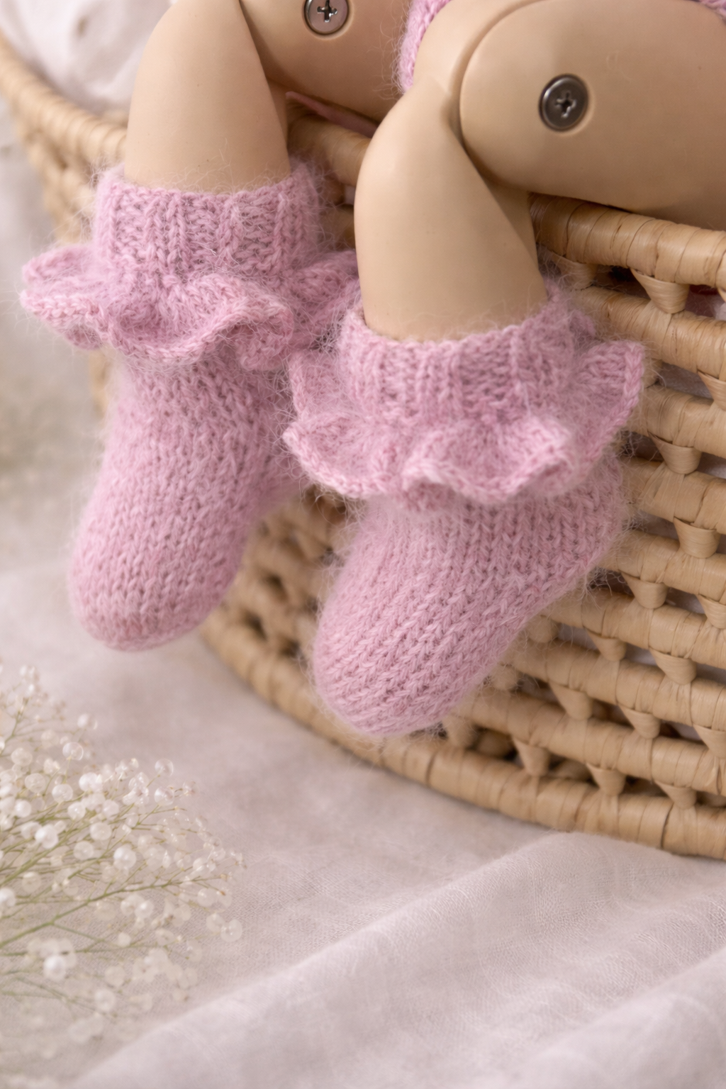 As Meias Babadinho Eloá Rose são confeccionadas em tricô manual com fio tipo angorá, extremamente macio e com leve efeito felpudo que traz suavidade e um toque aconchegante à peça.